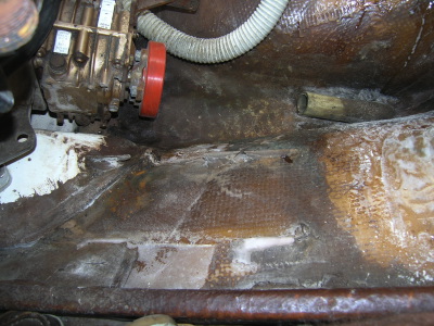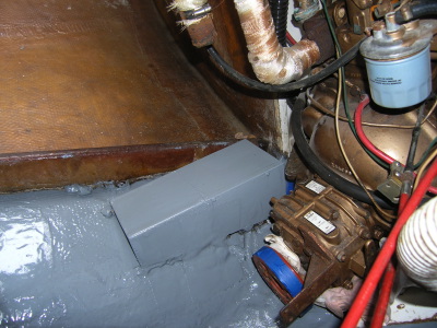 But while working on the platform for the new fuel tank I braced my foot on the muffler platform and it collapsed. It's probably just as well that it did -- it was saturated with oil and fuel and contributed to the oily smell that permeated the boat. Though it's difficult to see, this photo shows the muffler platform half missing. |
