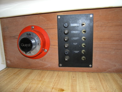 A peek behind the panel showed that an upgrade was a good idea. So I spent a few weeks looking for a new panel. I ended up finding a Blue Sea Systems panel on eBay for $204. The same panel, at that time, sold at rock-high-prices-West-Marine for somewhere between $400 and $500. |