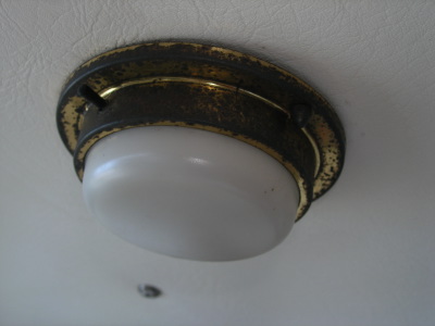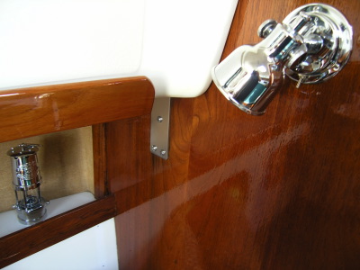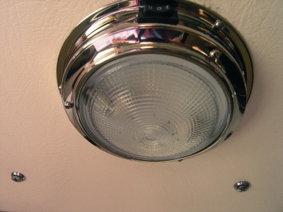 I didn't need to replace the old plastic berth-type lights -- they both worked -- but I think this is a big improvement. Notice the oil-lamp in the background. For all the new fixtures I went with chrome-plated brass. For one thing, it matched the chainplates. |