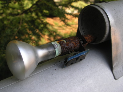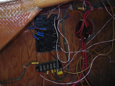 I also worked on upgrading most of the boat's electrics. The steaming/deck light, halfway up the mast, was beyond hope. Here, the deck light has been pulled from its housing. |
