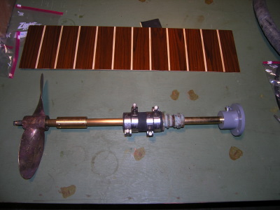 I used paint stripper to remove the paint from the prop, and I cleaned the stuffing box and replaced its packing. The cutlass bearing (next to the prop), stuffing box hose, clamps, and shaft coupling are all new. |