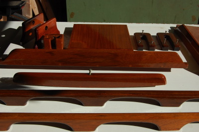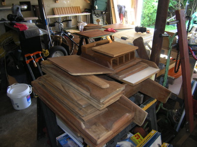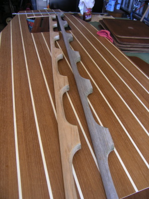 One of the first things I did when I got the boat in my driveway was to remove all removable teak pieces. I then separated these into three groups, and worked on sanding and varnishing one group at a time. |